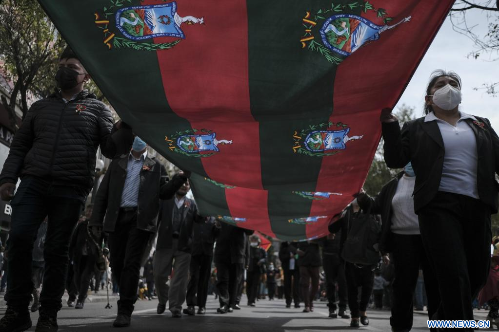 LA PAZ, 14 julio, 2022 (Xinhua) -- Maestros sostienen una bandera durante un desfile escolar llevado a cabo por el 213 aniversario de la gesta libertadora del departamento de La Paz del 16 de julio de 1809, en La Paz, Bolivia, el 14 de julio de 2022. (Xinhua/Mateo Romay)