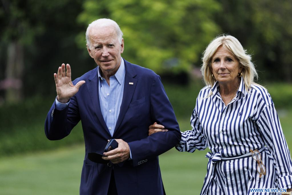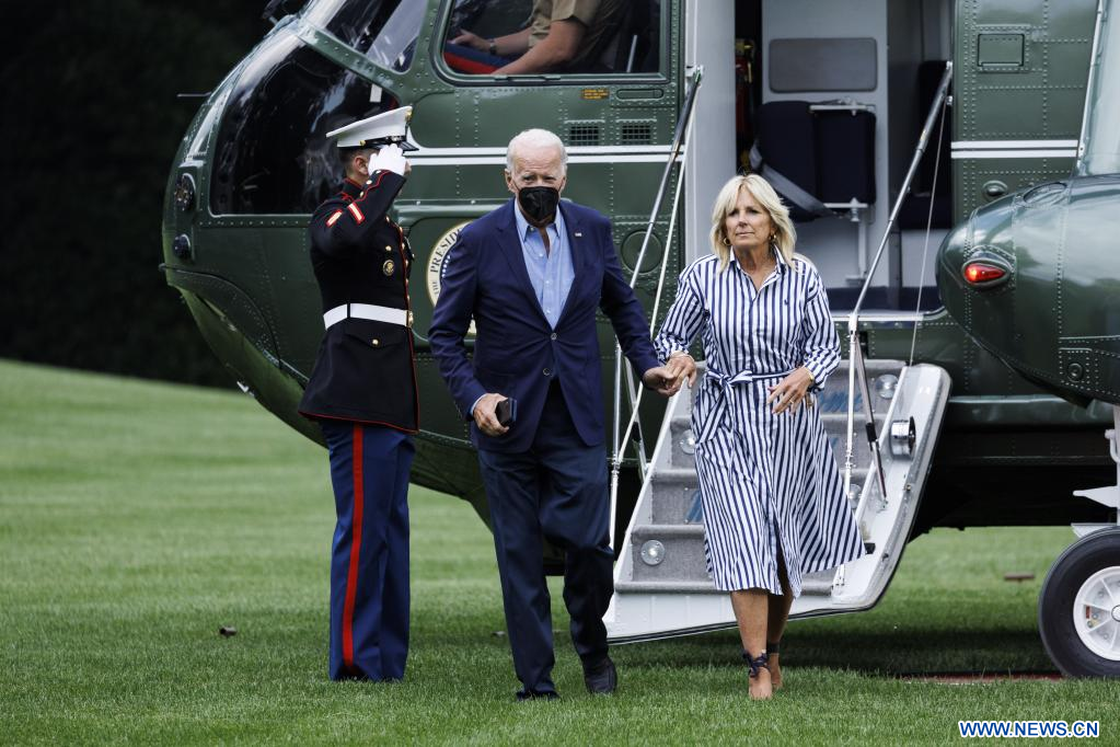 WASHINGTON D.C., 17 agosto, 2022 (Xinhua) -- Imagen del 8 de agosto de 2022 del presidente estadounidense, Joe Biden (c), y la primera dama, Jill Biden (d), regresando a la Casa Blanca, en Washington D.C., Estados Unidos. La primera dama de Estados Unidos, Jill Biden, dio positivo por COVID-19, informó el martes un portavoz. Jill Biden, de 71 años de edad, comenzó a presentar síntomas similares a los de un resfriado el lunes por la noche y una prueba de PCR resultó positiva, de acuerdo con el portavoz. (Xinuha/Ting Shen)