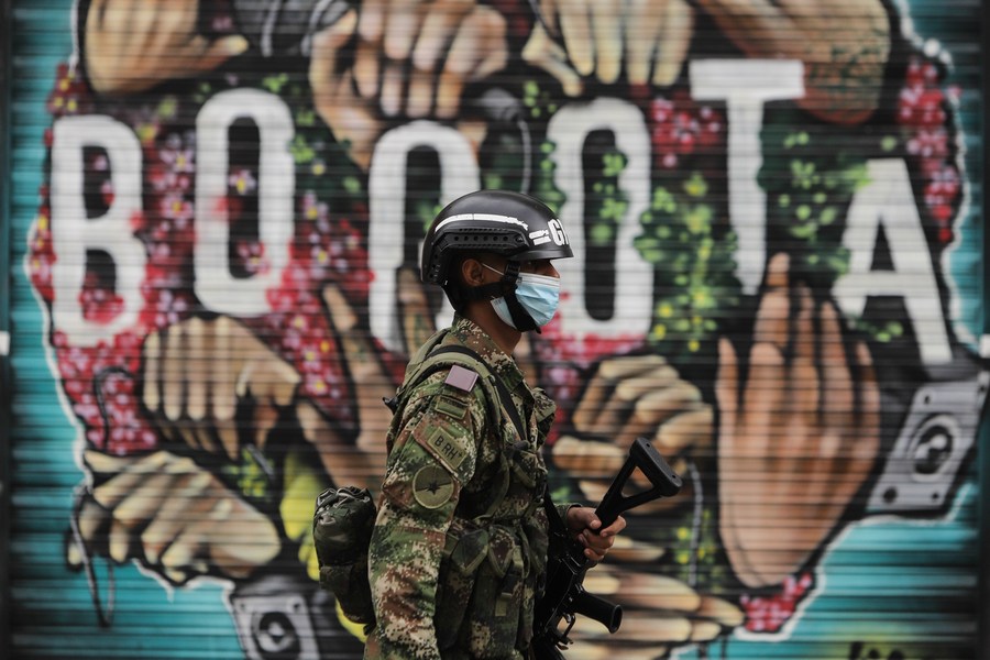 Un elemento de las Fuerzas Militares vigila en una céntrica calle de Bogotá, Colombia, el 24 de enero de 2021. (Xinhua/Jhon Paz)