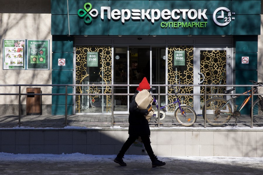 Una ciudadana camina por una calle, en Moscú, Rusia, el 9 de marzo de 2022. (Xinhua/Bai Xueqi)