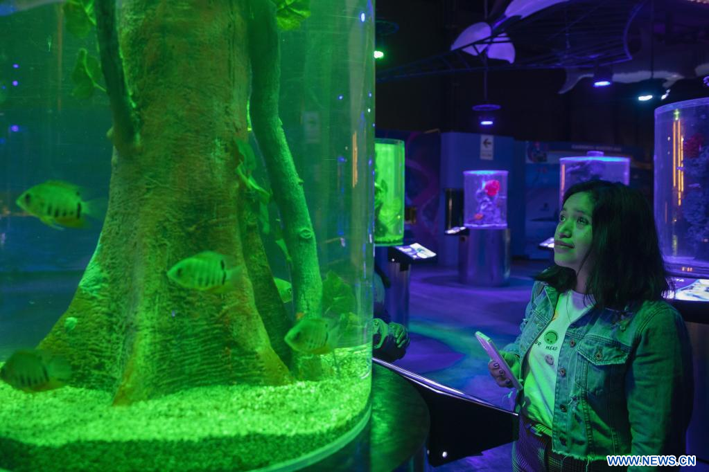 LIMA, 23 agosto, 2022 (Xinhua) -- Una mujer visita el acuario del Parque de la Imaginación, en el distrito de San Miguel, en Lima, Perú, el 23 de agosto de 2022. Sorprendidos y felices se observa a los peruanos que a diario visitan el acuario del Parque de la Imaginación, abierto en fecha reciente en la ciudad de Lima, un espacio que está considerado el más grande de Perú para promover la conservación de mar y ríos, así como de las especies que allí habitan. (Xinhua/Mariana Bazo)