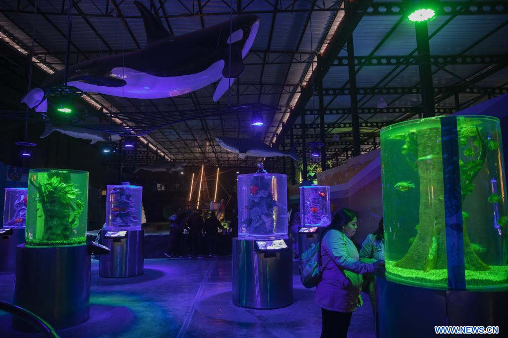 LIMA, 23 agosto, 2022 (Xinhua) -- Personas visitan el acuario del Parque de la Imaginación, en el distrito de San Miguel, en Lima, Perú, el 23 de agosto de 2022. Sorprendidos y felices se observa a los peruanos que a diario visitan el acuario del Parque de la Imaginación, abierto en fecha reciente en la ciudad de Lima, un espacio que está considerado el más grande de Perú para promover la conservación de mar y ríos, así como de las especies que allí habitan. (Xinhua/Mariana Bazo)