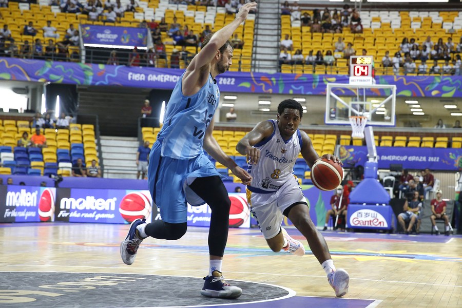 El jugador Trivante Bloodman (d), de Islas Vírgenes, disputa el balón con Marcos Delía (i), de Argentina, durante el partido correspondiente a la fase de grupos de la FIBA AmeriCup 2022, en Recife, estado de Pernambuco, Brasil, el 3 de septiembre de 2022. (Xinhua/Lucio Tavora)