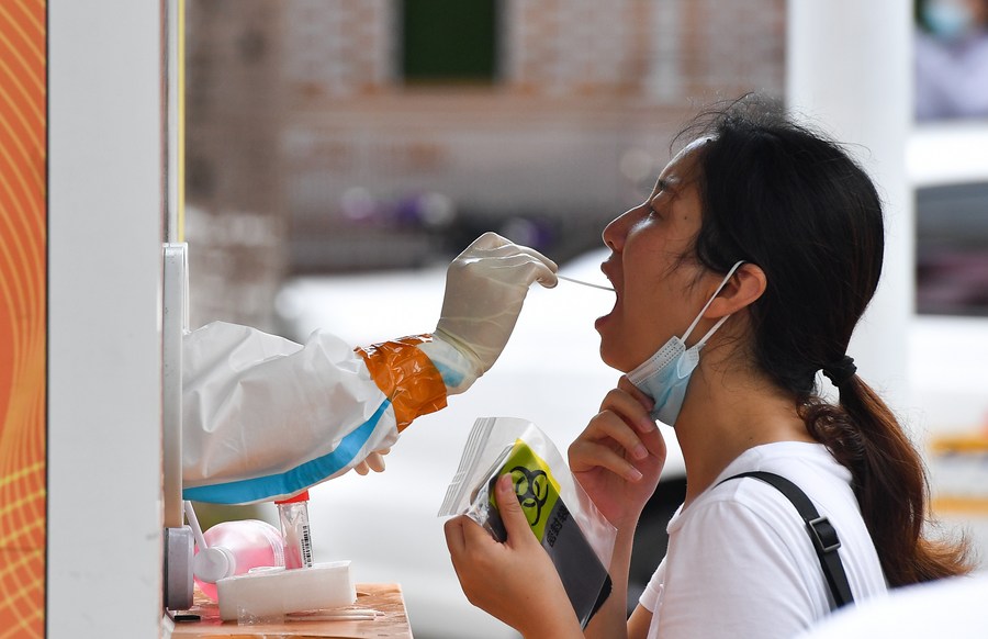 Una residente recibe una prueba de ácido nucleico en un sitio de pruebas, en el distrito de Longhua, en Haikou, en la provincia de Hainan, en el sur de China, el 7 de agosto de 2022. (Xinhua/Yang Guanyu)