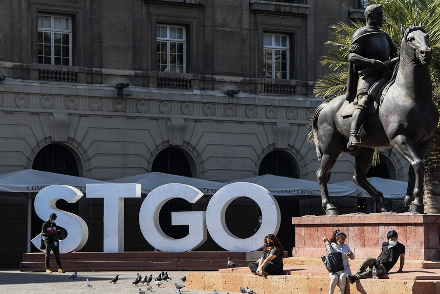 Personas toman asiento frente a un monumento en la Plaza de Armas, en Santiago, capital de Chile, el 29 de marzo de 2021. (Xinhua/Jorge Villegas)