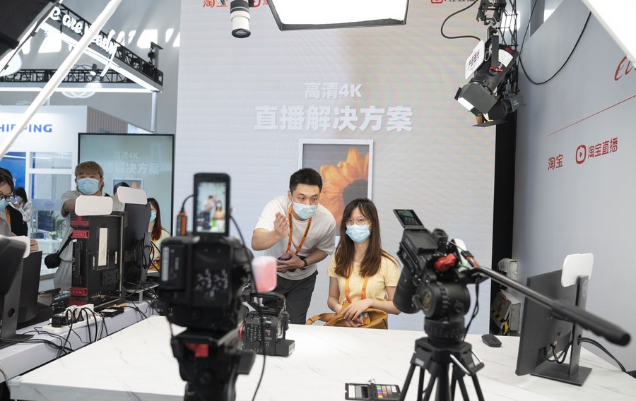Personas experimentan la transmisión en vivo 4K en el estand de Alibaba durante la Feria Internacional de Comercio de Servicios de China 2022 (CIFTIS, por sus siglas en inglés), en Beijing, capital de China, el 1 de septiembre de 2022. (Xinhua/Cai Yang)