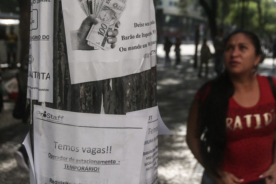 Imagen de archivo de una mujer observando carteles con ofertas de empleo pegados en un poste, en el centro de Sao Paulo, Brasil. (Xinhua/Rahel Patrasso)
