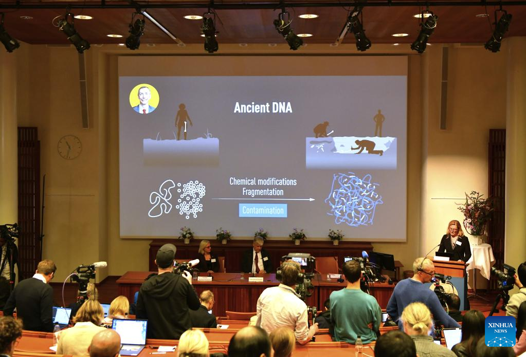 El anuncio del ganador del Premio Nobel de Fisiología y Medicina 2022 se lleva a cabo en el Instituto Karolinska, en Estocolmo, Suecia, el 3 de octubre de 2022. El genetista sueco, Svante Paabo, ganó el Premio Nobel de Fisiología y Medicina 2022 por sus descubrimientos "sobre los genomas de los homínidos extintos y la evolución humana", anunció el lunes el comité del Nobel. (Xinhua/Ren Pengfei)
