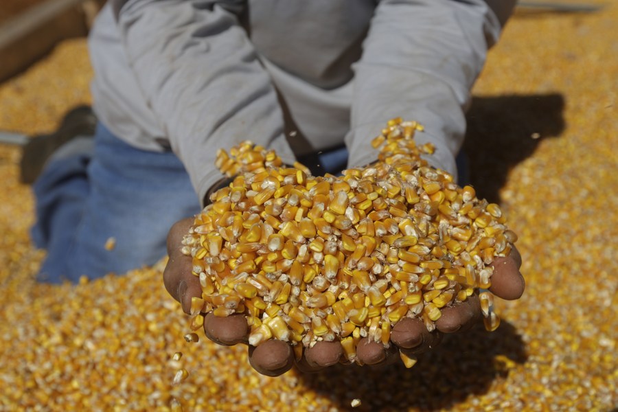 Un trabajador rural muestra granos de maíz durante la cosecha en la granja Nativa, en el área rural de Brasilia, Brasil, el 14 de julio de 2022. (Xinhua/Lucio Tavora)