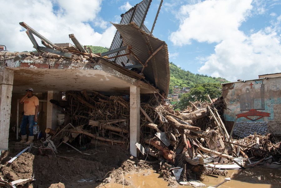 Un hombre se lamenta dentro de una vivienda afectada por un deslave, en Las Tejerías, estado de Aragua, Venezuela, el 10 de octubre de 2022. (Xinhua/Marcos Salgado)