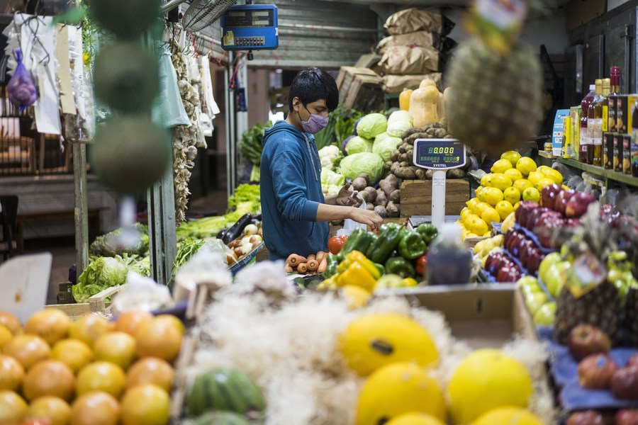 Imagen de archivo de un trabajador vendiendo frutas y verduras en un puesto en el Mercado de San Telmo, en la ciudad de Buenos Aires, Argentina. (Xinhua/Martín Zabala)