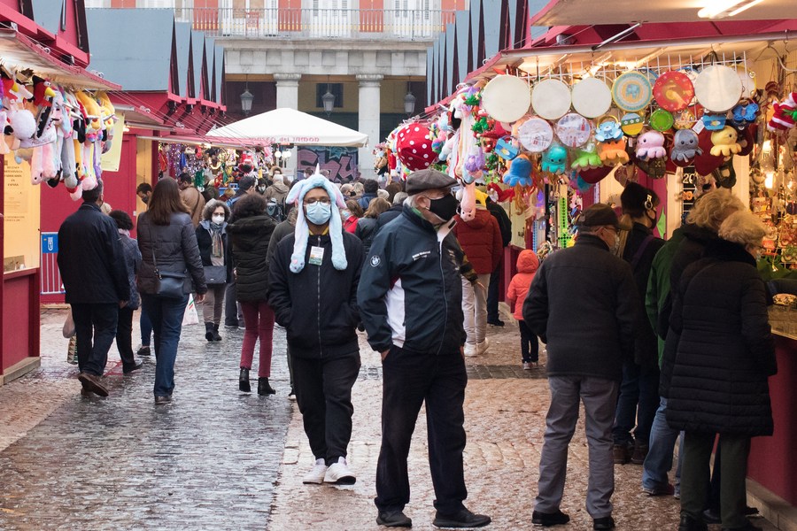 Imagen del 21 de diciembre de 2020 de personas visitando un bazar navideño en la Plaza Mayor, en Madrid, capital de España. (Xinhua/Edward F. Peters)