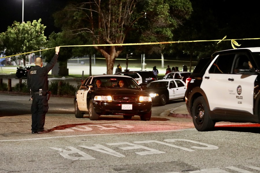 Imagen del 24 de julio de 2022 de oficiales de policía investigando después de un tiroteo en el Peck Park, en Los Angeles, California, Estados Unidos. (Xinhua/Str)