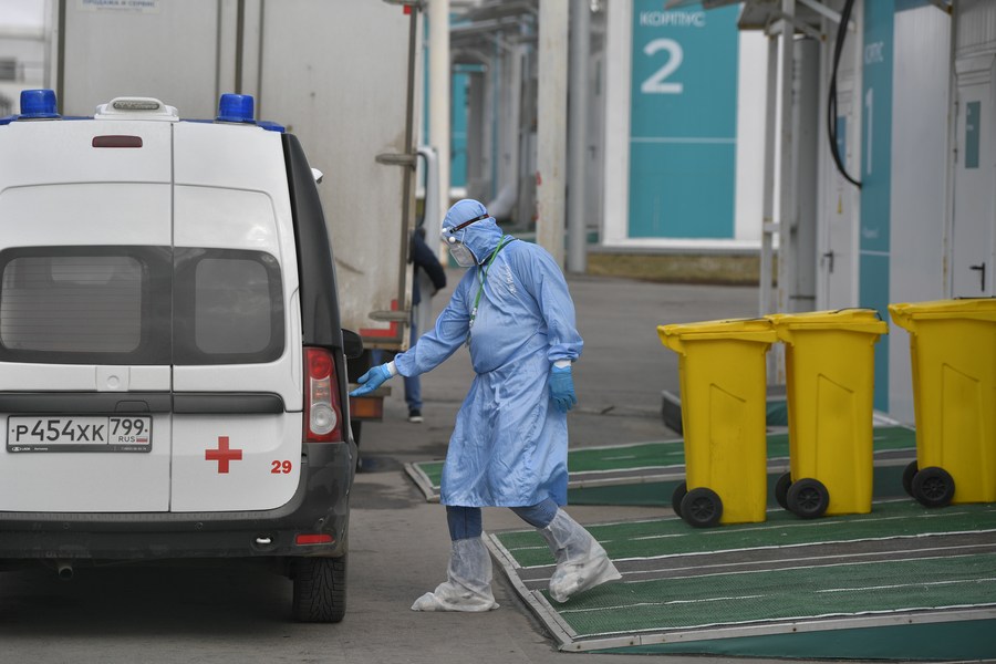 Imagen del 15 de abril de 2022 de un trabajador médico portando equipo protector mientras sube a una ambulancia en un hospital, en Kommunarka, en el suburbio de Moscú, Rusia. (Xinhua/Alexander Zemlianichenko)