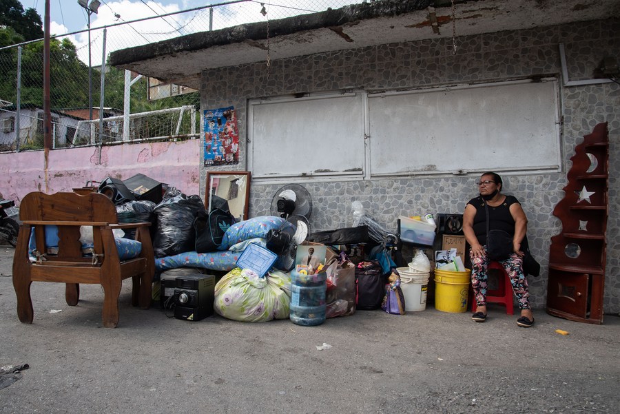 Una mujer descansa frente a pertenencias retiradas de una vivienda afectada por los deslizamientos de tierra tras las fuertes lluvias, en Caracas, Venezuela, el 25 de octubre de 2022. (Xinhua/Marcos Salgado)