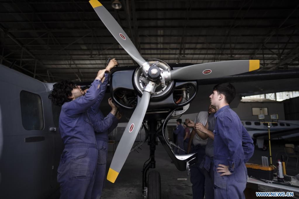 Imagen del 28 de octubre de 2022 de un alumno de la Escuela Secundaria Técnica N° 7 realizando ajustes en una de las alas del avión Aero Commander 501 en un hangar de la institución, en la ciudad de Quilmes, Argentina. Alumnos de una escuela secundaria de Argentina se propusieron reparar un avión que transportó material y pilotos a las Islas Malvinas durante el conflicto bélico que el país sudamericano protagonizó con el Reino Unido en 1982, un proyecto que entusiasma a sus protagonistas porque permite recuperar y poner en valor una parte importante de la historia nacional. (Xinhua/Martín Zabala)