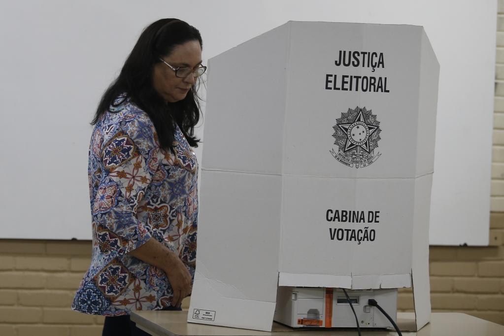 BRASILIA, 30 octubre, 2022 (Xinhua) -- Una mujer emite su voto durante la segunda vuelta de las elecciones presidenciales en una casilla electoral, en Brasilia, Brasil, el 30 de octubre de 2022. Los colegios electorales de Brasil han abierto el domingo sus puertas para la segunda vuelta de las elecciones presidenciales en la que el exmandatario Luiz Inácio Lula da Silva, del Partido de los Trabajadores (PT), se medirá con el actual gobernante, Jair Bolsonaro, candidato por el Partido Liberal (PL). Durante esta jornada, desde las 08:00 hora local (11:00 GMT) hasta las 17:00 hora local (20:00 GMT), están convocados unos 156,4 millones de votantes brasileños para elegir al presidente y vicepresidente del país, en tanto 12 estados elegirán en segunda vuelta a su gobernador. (Xinhua/Lucio Tavora)