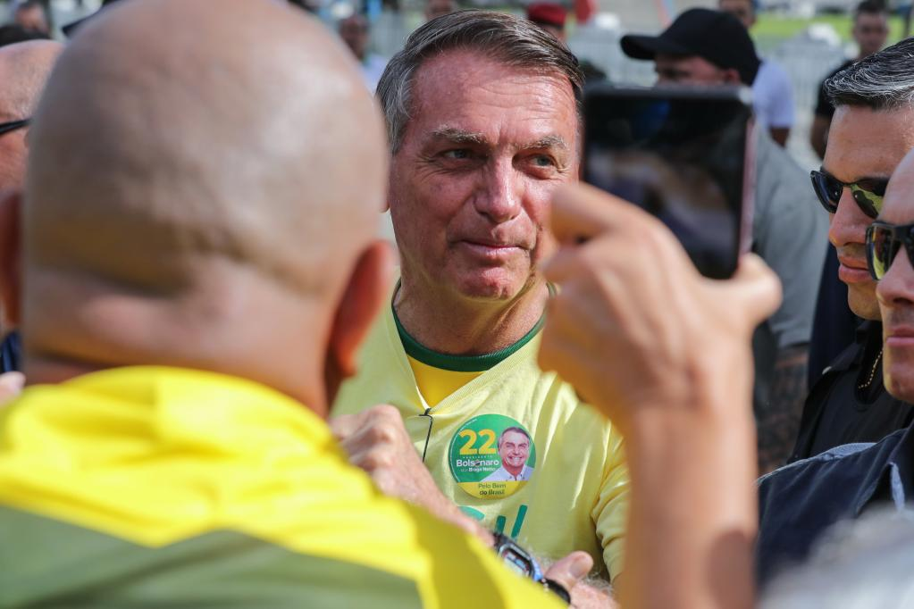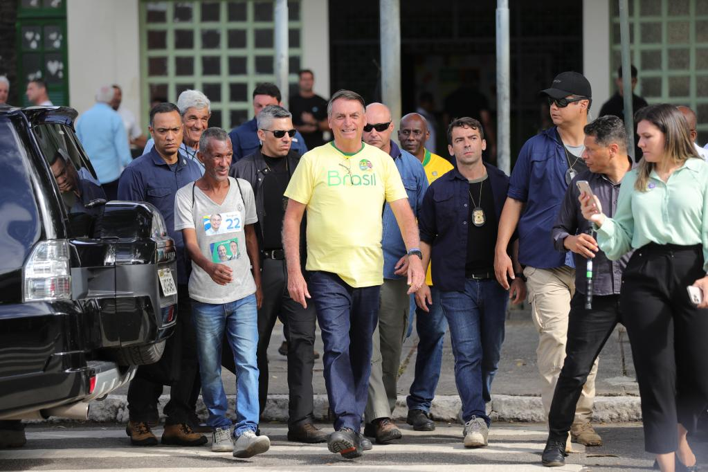 RIO DE JANEIRO, 30 octubre, 2022 (Xinhua) -- El presidente brasileño, Jair Bolsonaro (c), se retira de una casilla electoral después de emitir su voto en Río de Janeiro, Brasil, el 30 de octubre de 2022. Los colegios electorales de Brasil han abierto el domingo sus puertas para la segunda vuelta de las elecciones presidenciales en la que el exmandatario Luiz Inácio Lula da Silva, del Partido de los Trabajadores (PT), se medirá con el actual gobernante, Jair Bolsonaro, candidato por el Partido Liberal (PL). Durante esta jornada, desde las 08:00 hora local (11:00 GMT) hasta las 17:00 hora local (20:00 GMT), están convocados unos 156,4 millones de votantes brasileños para elegir al presidente y vicepresidente del país, en tanto 12 estados elegirán en segunda vuelta a su gobernador. (Xinhua/Wang Tiancong)