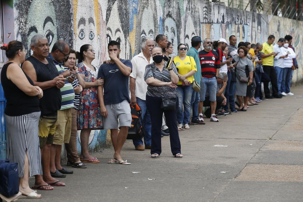 BRASILIA, 30 octubre, 2022 (Xinhua) -- Votantes esperan formados para que empiecen las votaciones durante la segunda vuelta de las elecciones presidenciales en una casilla electoral, en Brasilia, Brasil, el 30 de octubre de 2022. Los colegios electorales de Brasil han abierto el domingo sus puertas para la segunda vuelta de las elecciones presidenciales en la que el exmandatario Luiz Inácio Lula da Silva, del Partido de los Trabajadores (PT), se medirá con el actual gobernante, Jair Bolsonaro, candidato por el Partido Liberal (PL). Durante esta jornada, desde las 08:00 hora local (11:00 GMT) hasta las 17:00 hora local (20:00 GMT), están convocados unos 156,4 millones de votantes brasileños para elegir al presidente y vicepresidente del país, en tanto 12 estados elegirán en segunda vuelta a su gobernador. (Xinhua/Lucio Tavora)