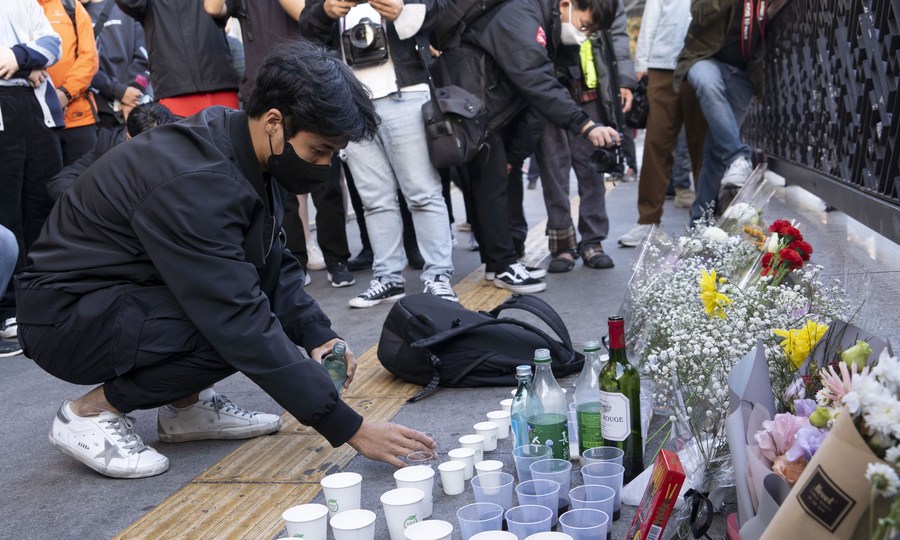 Personas se lamentan por las víctimas de una estampida mortal, en Itaewon, un distrito de Seúl, República de Corea, el 30 de octubre de 2022. Al menos 153 personas murieron y otras 103 resultaron heridas en una estampida que ocurrió el sábado por la noche, en el distrito de Itaewon, en Seúl, durante las reuniones de Halloween, informaron el domingo las autoridades locales. (Xinhua/James Lee)