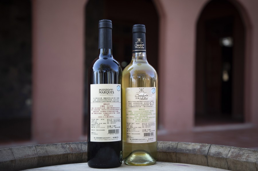 Imagen del 25 de septiembre de 2019 de dos botellas de vino malbec (i) y torrontés (d), cuyas etiquetas traseras se encuentran escritas en idioma chino, captadas en la bodega Puesto del Marqués ubicada en la localidad de Santa María, provincia de Catamarca, a 1.351 kilómetros de la ciudad de Buenos Aires, capital de Argentina. Cinco bodegas de la cordillera occidental de Argentina se preparan para llevar sus vinos a la segunda Exposición Internacional de Importaciones de China (CIIE, por sus siglas en inglés) (Xinhua/Martín Zabala)