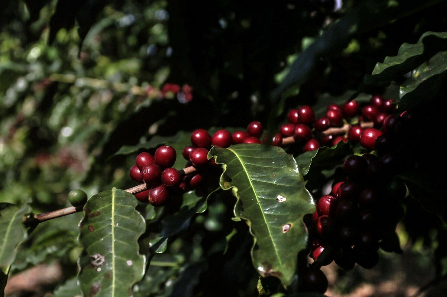 Vista de granos de café listos para ser cosechados en el estado de Sao Paulo, en el marco del Día Nacional del Café, el 24 de mayo de 2018. (Xinhua/Rahel Patrasso)