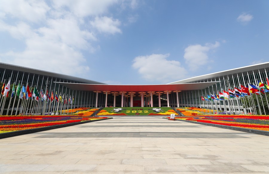 Imagen del 2 de noviembre de 2022 de la plaza sur del Centro Nacional de Exposiciones y Convenciones (Shanghai), la sede principal de la próxima quinta Exposición Internacional de Importaciones de China (CIIE), en Shanghai, en el este de China. La quinta CIIE se celebra del 5 al 10 de noviembre con la participación de representantes de 145 países, regiones y organizaciones internacionales. (Xinhua/Fang Zhe)