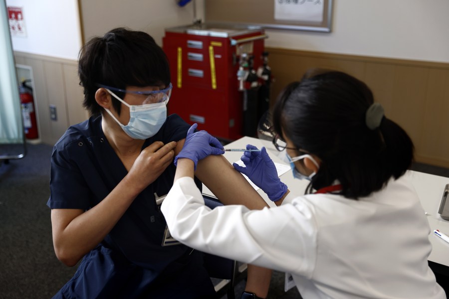 Imagen de archivo de un trabajador médico recibiendo una dosis de una vacuna contra la COVID-19 mientras el país empieza su campaña de vacunación, en el Centro Médico de Tokio, en Tokio, Japón, el 17 de febrero de 2021. (Xinhua/Behrouz Mehri/Pool)