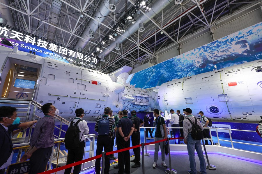 Visitantes aprecian el modelo a escala 1:1 de la combinación de la estación espacial de China que se exhiben en la XIV Exposición Internacional de Aviación y Aeroespacio de China, en Zhuhai, ciudad de la provincia meridional china de Guangdong, el 9 de noviembre de 2022. (Xinhua/Liu Dawei)