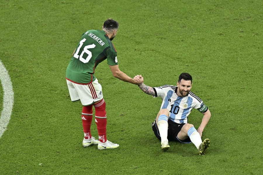 Héctor Herrera, de México, estrecha la mano con Lionel Messi, de Argentina, durante el partido correspondiente al Grupo C entre Argentina y México en la Copa Mundial de la FIFA 2022 en el Estadio Lusail, en Lusail, Qatar, el 26 de noviembre de 2022. (Xinhua/Xin Yuewei)