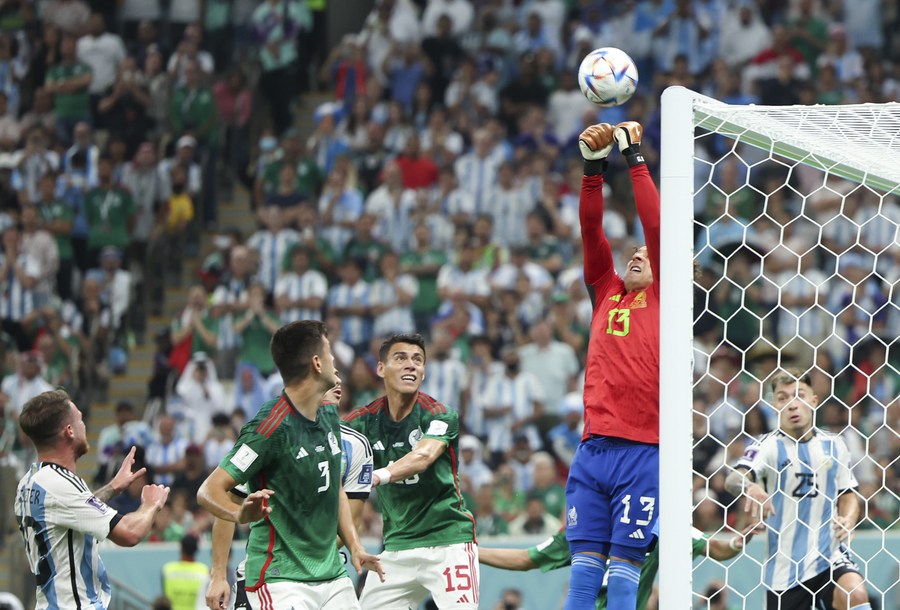 Guillermo Ochoa, guardameta de México, defiende el balón durante el partido correspondiente al Grupo C entre Argentina y México en la Copa Mundial de la FIFA 2022 en el Estadio Lusail, en Lusail, Qatar, el 26 de noviembre de 2022. (Xinhua/Pan Yulong)