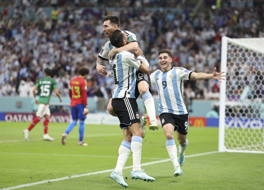 Lionel Messi (arriba), Julián Álvarez (d) y Angel Di María, de Argentina, festejan después de anotar durante el partido correspondiente al Grupo C entre Argentina y México en la Copa Mundial de la FIFA 2022 en el Estadio Lusail, en Lusail, Qatar, el 26 de noviembre de 2022. (Xinhua/Xu Zijian)