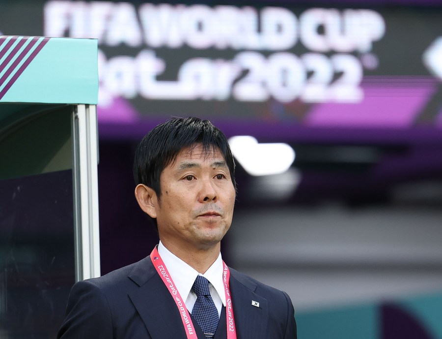 El seleccionador de Japón, Hajime Moriyasu, reacciona previo al partido del Grupo E entre Alemania y Japón en la Copa Mundial de la FIFA 2022 en el Estadio Internacional Khalifa, en Doha, Qatar, el 23 de noviembre de 2022. (Xinhua/Pan Yulong)