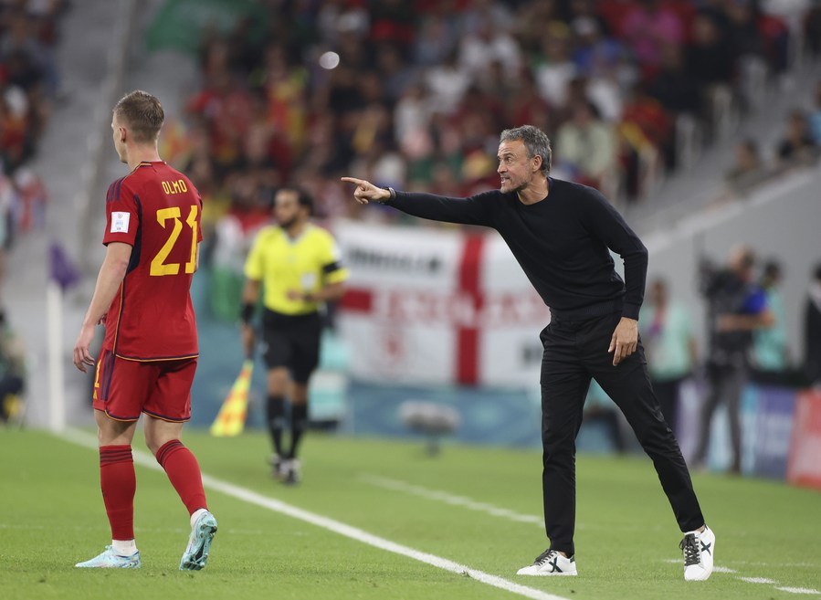 Luis Enrique (d), director técnico de España, gesticula durante partido del Grupo E entre España y Costa Rica en la Copa Mundial de la FIFA 2022 en el Estadio Al Thumama, en Doha, Qatar, el 23 de noviembre de 2022. (Xinhua/Li Ming)