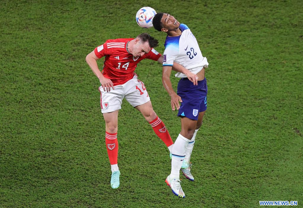 AL RAYYAN, 29 noviembre, 2022 (Xinhua) -- Connor Roberts (i), de Gales, y Jude Bellingham, de Inglaterra, cabecean el balón durante el partido correspondiente al Grupo B entre Gales e Inglaterra en la Copa Mundial de la FIFA 2022, en el Estadio Ahmad Bin Ali, en Al Rayyan, Qatar, el 29 de noviembre de 2022. (Xinhua/Wang Dongzhen)