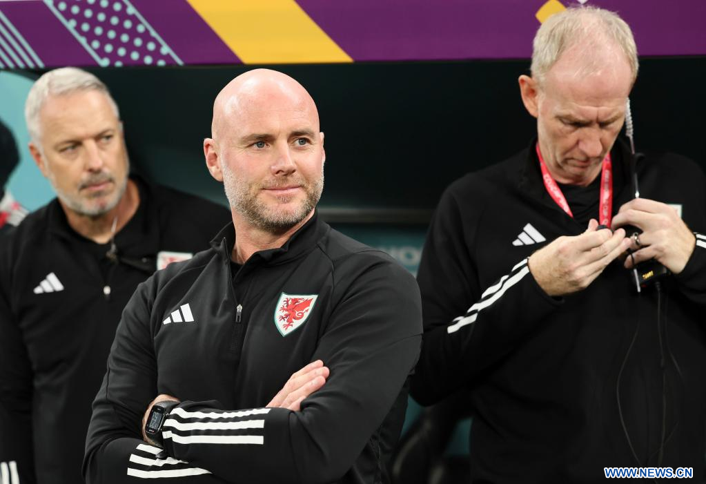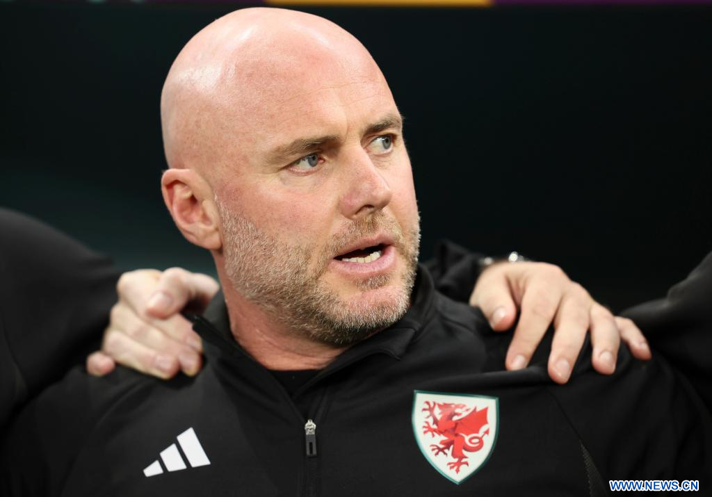AL RAYYAN, 29 noviembre, 2022 (Xinhua) -- Rob Page (c), director técnico de Gales, reacciona previo al partido correspondiente al Grupo B entre Gales e Inglaterra en la Copa Mundial de la FIFA 2022, en el Estadio Ahmad Bin Ali, en Al Rayyan, Qatar, el 29 de noviembre de 2022. (Xinhua/Lan Hongguang)