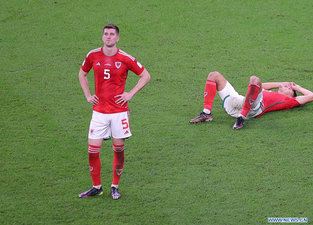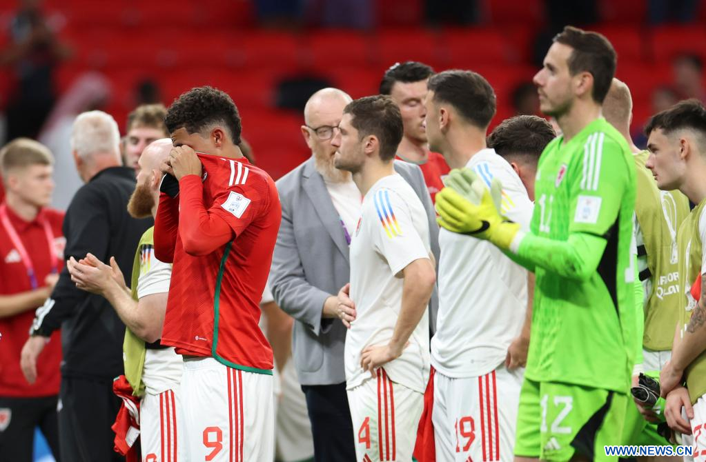 AL RAYYAN, 29 noviembre, 2022 (Xinhua) -- Jugadores de Gales reaccionan después del partido correspondiente al Grupo B entre Gales e Inglaterra en la Copa Mundial de la FIFA 2022, en el Estadio Ahmad Bin Ali, en Al Rayyan, Qatar, el 29 de noviembre de 2022. (Xinhua/Li Ming)