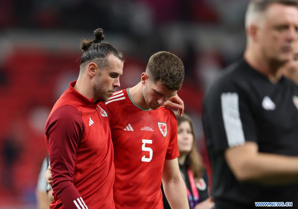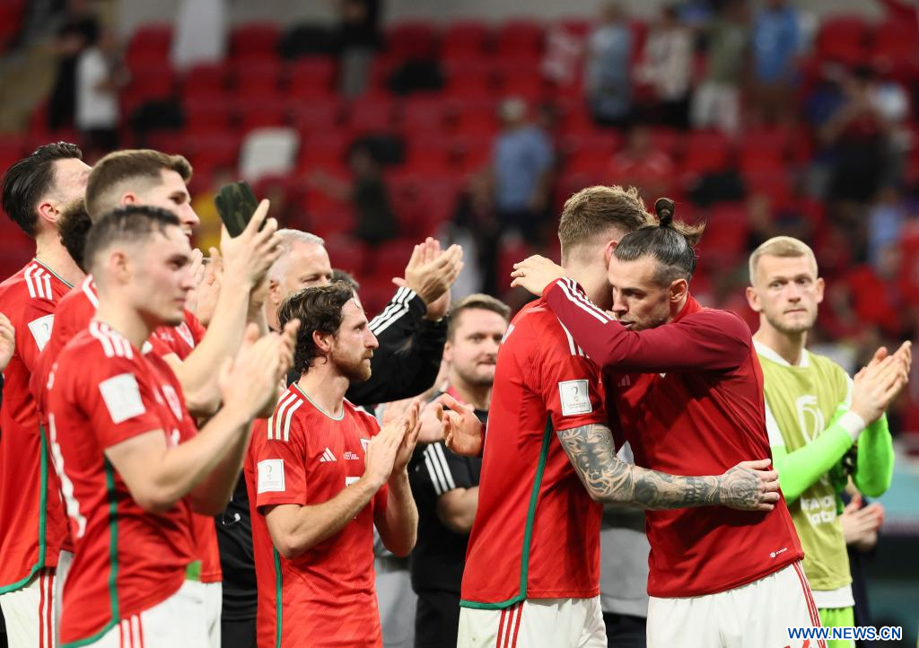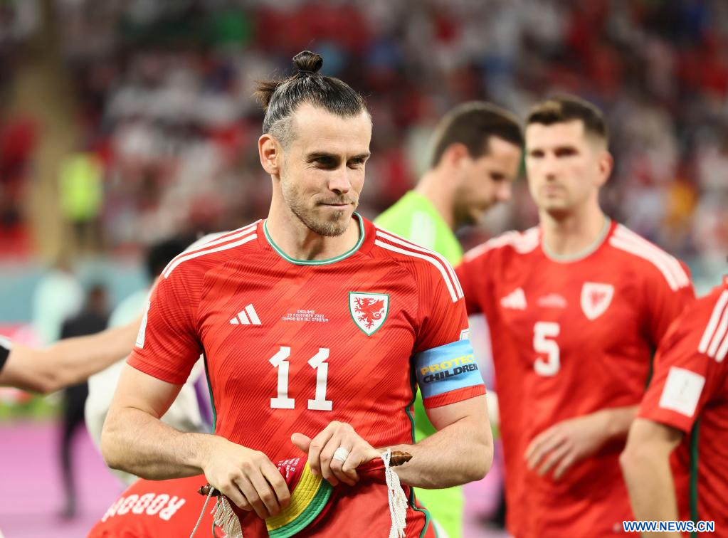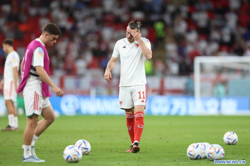 AL RAYYAN, 29 noviembre, 2022 (Xinhua) -- Gareth Bales (i), de Gales, reacciona después del partido correspondiente al Grupo B entre Gales e Inglaterra en la Copa Mundial de la FIFA 2022, en el Estadio Ahmad Bin Ali, en Al Rayyan, Qatar, el 29 de noviembre de 2022. (Xinhua/Li Ming)