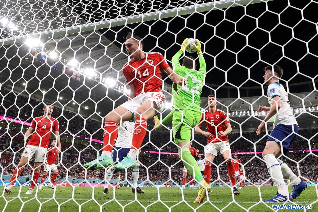 AL RAYYAN, 29 noviembre, 2022 (Xinhua) -- Danny Ward (2-i), guardameta de Gales, atrapa el balón durante el partido correspondiente al Grupo B entre Gales e Inglaterra en la Copa Mundial de la FIFA 2022, en el Estadio Ahmad Bin Ali, en Al Rayyan, Qatar, el 29 de noviembre de 2022. (Xinhua/Li Ming)
