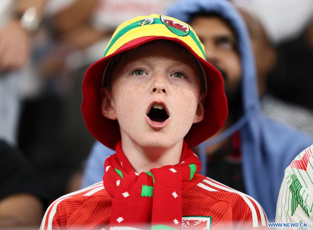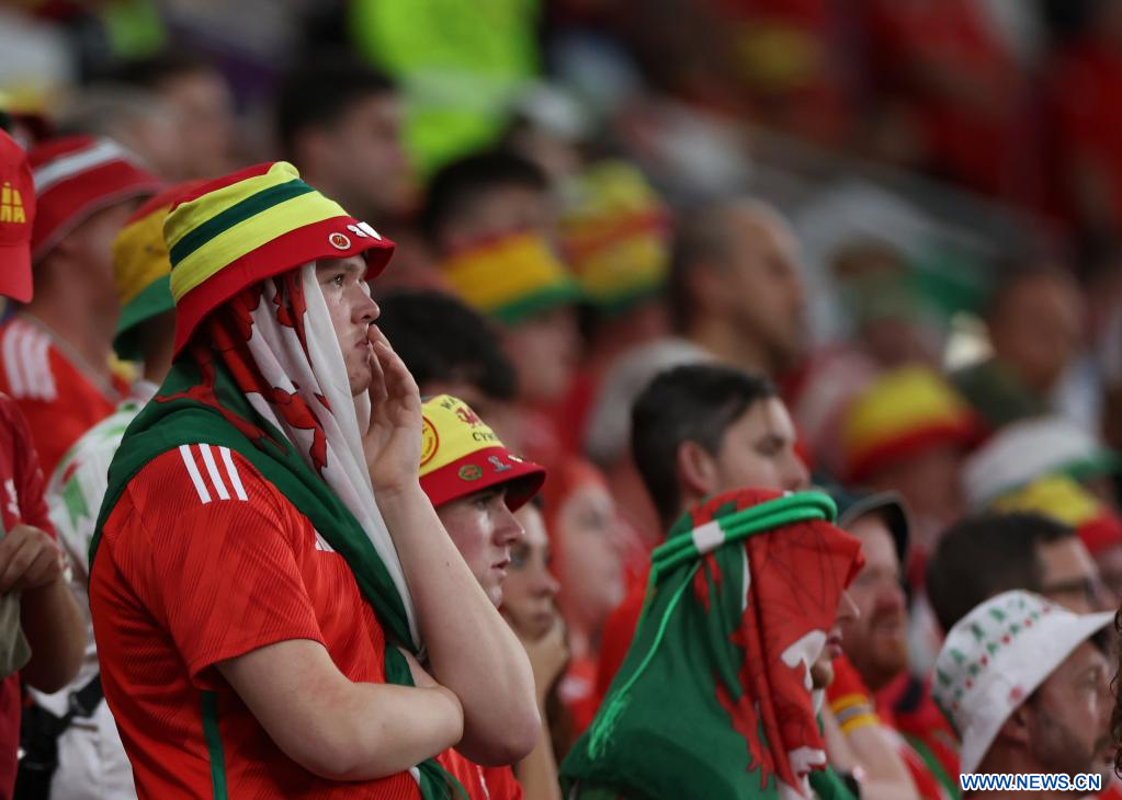 AL RAYYAN, 29 noviembre, 2022 (Xinhua) -- Aficionados de Gales reaccionan durante el partido correspondiente al Grupo B entre Gales e Inglaterra en la Copa Mundial de la FIFA 2022, en el Estadio Ahmad Bin Ali, en Al Rayyan, Qatar, el 29 de noviembre de 2022. (Xinhua/Li Ming)
