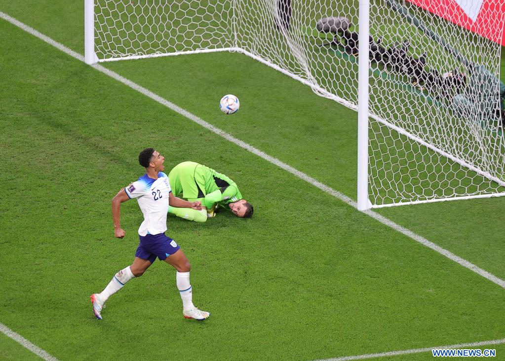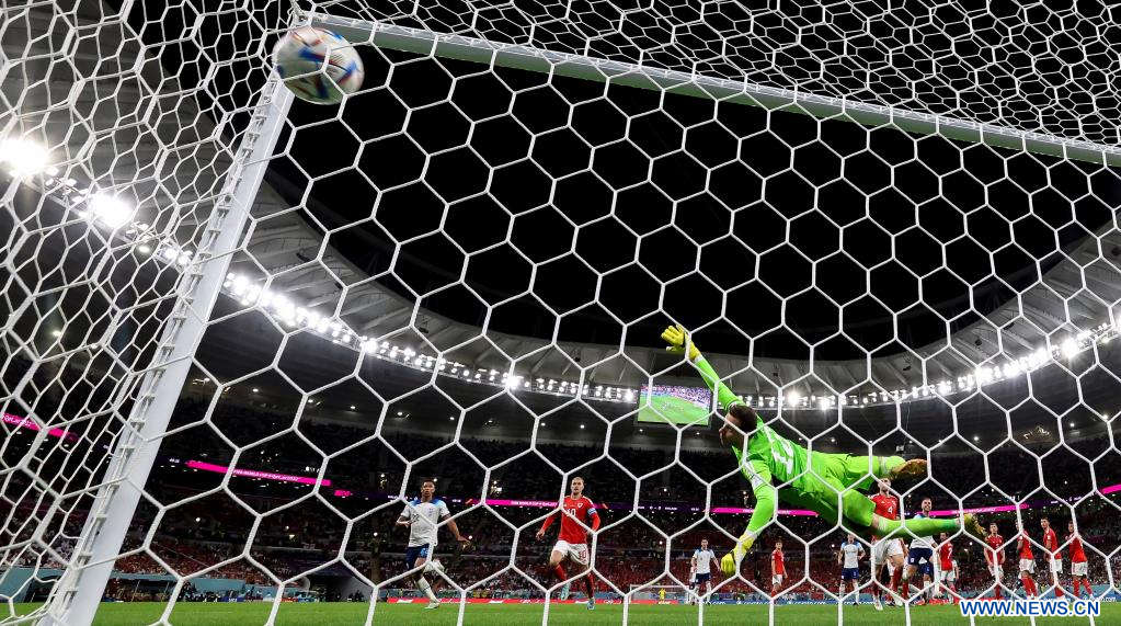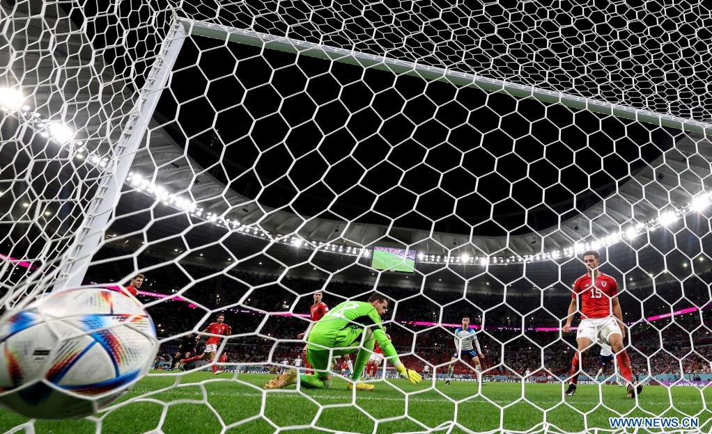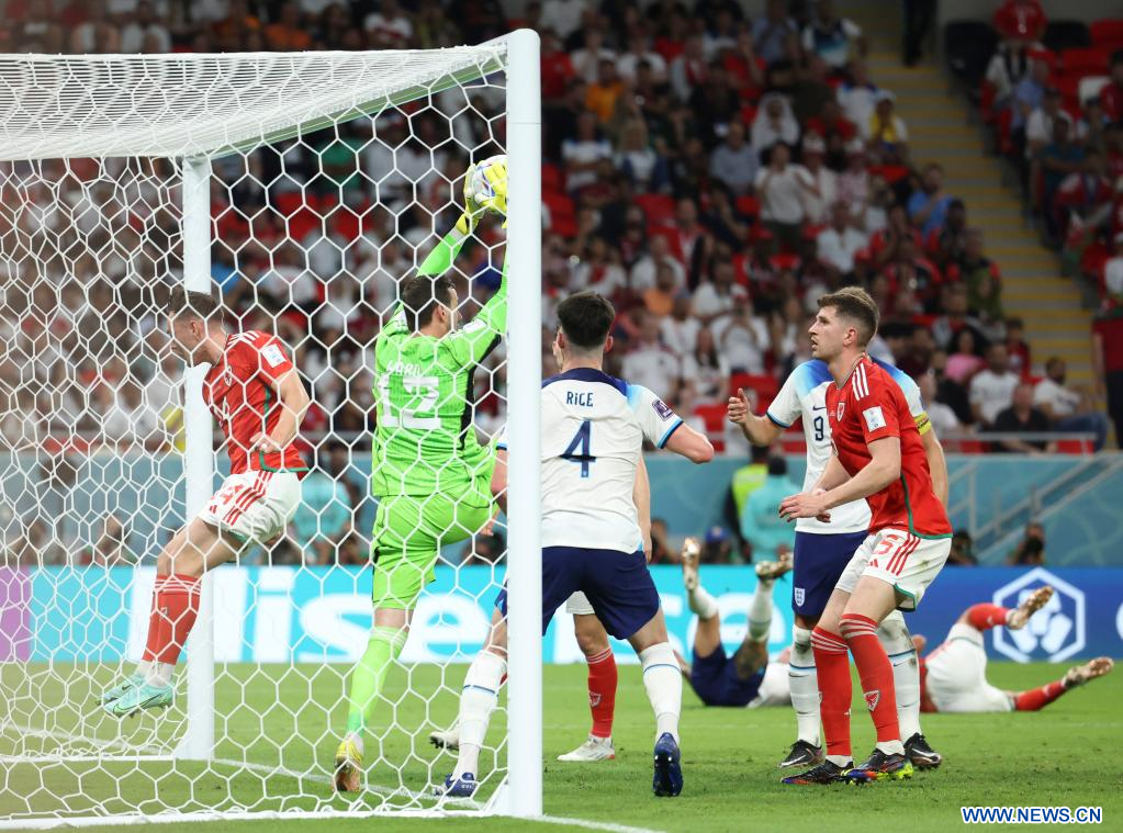 AL RAYYAN, 29 noviembre, 2022 (Xinhua) -- Danny Ward (d), guardameta de Gales, no logra atajar el balón durante el partido correspondiente al Grupo B entre Gales e Inglaterra en la Copa Mundial de la FIFA 2022, en el Estadio Ahmad Bin Ali, en Al Rayyan, Qatar, el 29 de noviembre de 2022. (Xinhua/Wang Dongzhen)