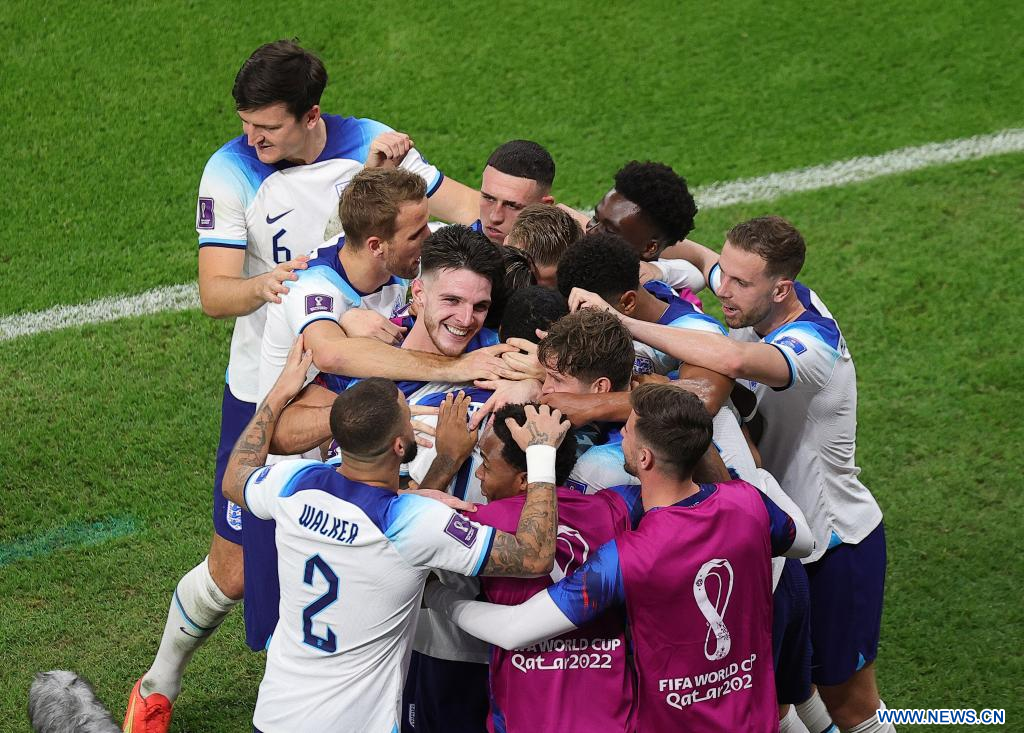 AL RAYYAN, 29 noviembre, 2022 (Xinhua) -- Jugadores de Inglaterra festejan una anotación durante el partido correspondiente al Grupo B entre Gales e Inglaterra en la Copa Mundial de la FIFA 2022, en el Estadio Ahmad Bin Ali, en Al Rayyan, Qatar, el 29 de noviembre de 2022. (Xinhua/Xiao Yijiu)