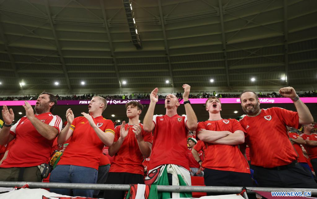 AL RAYYAN, 29 noviembre, 2022 (Xinhua) -- Aficionados de Gales animan al equipo previo al partido correspondiente al Grupo B entre Gales e Inglaterra en la Copa Mundial de la FIFA 2022, en el Estadio Ahmad Bin Ali, en Al Rayyan, Qatar, el 29 de noviembre de 2022. (Xinhua/Lan Hongguang)