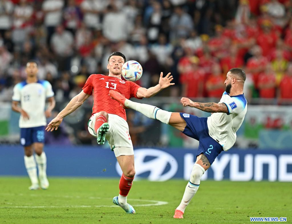 AL RAYYAN, 29 noviembre, 2022 (Xinhua) -- Kyle Walker (d), de Inglaterra, disputa el balón con Kieffer Moore, de Gales, durante el partido correspondiente al Grupo B entre Gales e Inglaterra en la Copa Mundial de la FIFA 2022, en el Estadio Ahmad Bin Ali, en Al Rayyan, Qatar, el 29 de noviembre de 2022. (Xinhua/Xiao Yijiu)