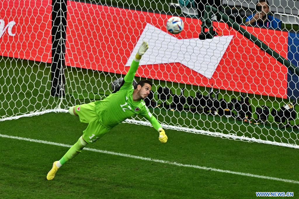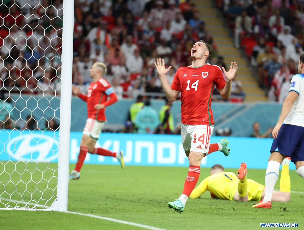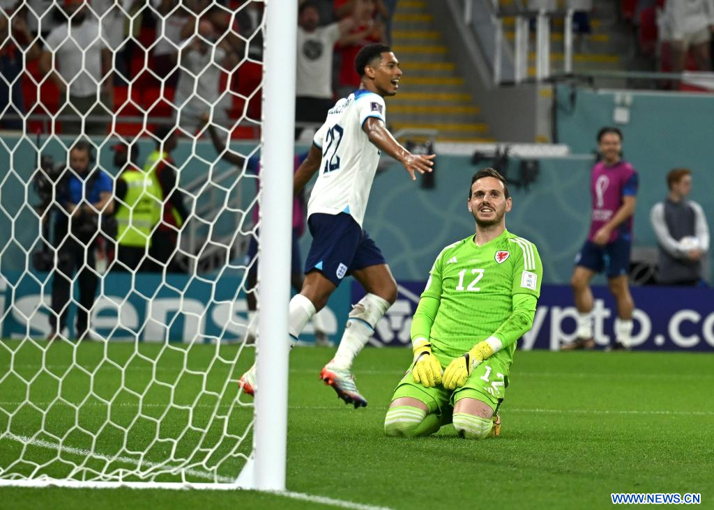 AL RAYYAN, 29 noviembre, 2022 (Xinhua) -- Danny Ward (d), guardameta de Gales, reacciona durante el partido correspondiente al Grupo B entre Gales e Inglaterra en la Copa Mundial de la FIFA 2022, en el Estadio Ahmad Bin Ali, en Al Rayyan, Qatar, el 29 de noviembre de 2022. (Xinhua/Xiao Yijiu)