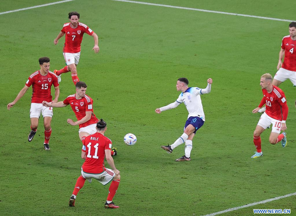 AL RAYYAN, 29 noviembre, 2022 (Xinhua) -- Phil Foden (3-d), de Inglaterra, dispara durante el partido correspondiente al Grupo B entre Gales e Inglaterra en la Copa Mundial de la FIFA 2022, en el Estadio Ahmad Bin Ali, en Al Rayyan, Qatar, el 29 de noviembre de 2022. (Xinhua/Wang Dongzhen)