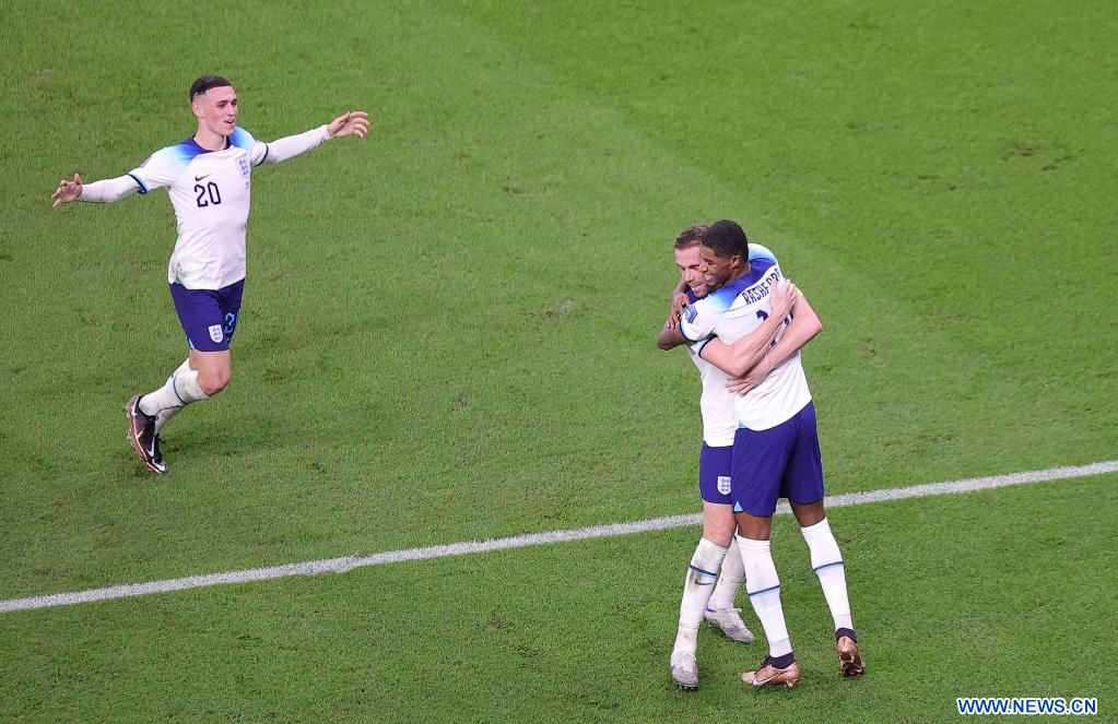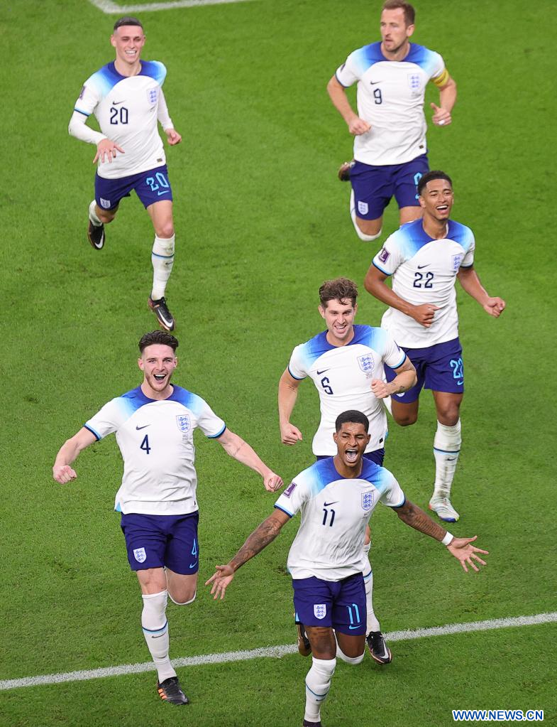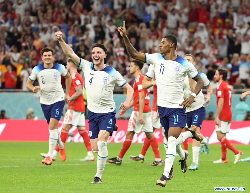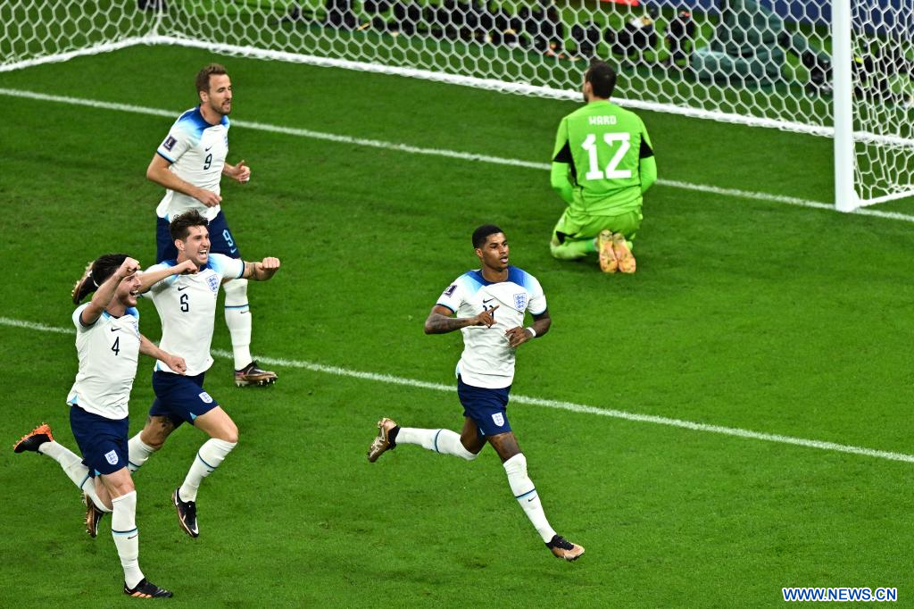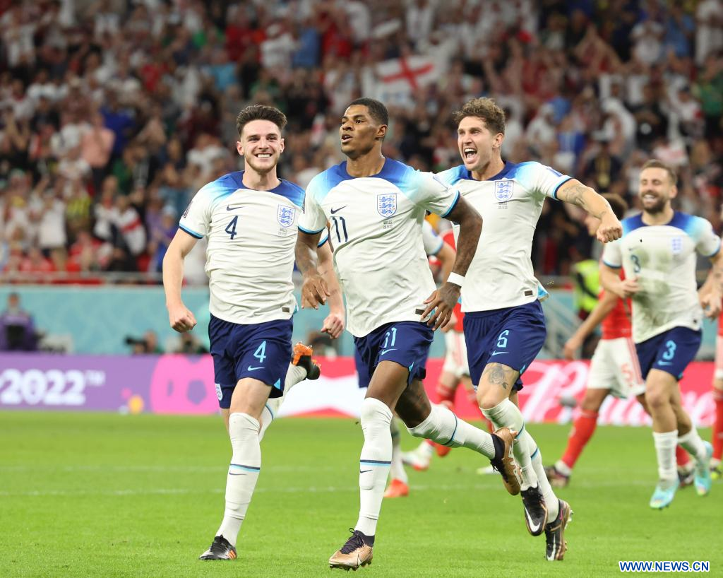 AL RAYYAN, 29 noviembre, 2022 (Xinhua) -- Marcus Rashford (2-d), de Inglaterra, festeja después de anotar durante el partido correspondiente al Grupo B entre Gales e Inglaterra en la Copa Mundial de la FIFA 2022, en el Estadio Ahmad Bin Ali, en Al Rayyan, Qatar, el 29 de noviembre de 2022. (Xinhua/Xin Yuewei)
