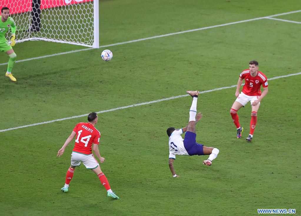 AL RAYYAN, 29 noviembre, 2022 (Xinhua) -- Danny Ward, guardameta de Gales, no logra atajar el gol de Marcus Rashford, de Inglaterra, durante el partido correspondiente al Grupo B entre Gales e Inglaterra en la Copa Mundial de la FIFA 2022, en el Estadio Ahmad Bin Ali, en Al Rayyan, Qatar, el 29 de noviembre de 2022. (Xinhua/Xin Yuewei)