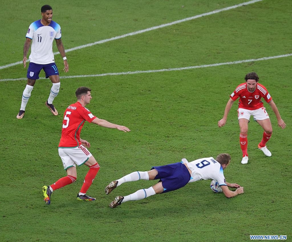 AL RAYYAN, 29 noviembre, 2022 (Xinhua) -- Harry Kane (abajo), de Inglaterra, cae durante el partido correspondiente al Grupo B entre Gales e Inglaterra en la Copa Mundial de la FIFA 2022, en el Estadio Ahmad Bin Ali, en Al Rayyan, Qatar, el 29 de noviembre de 2022. (Xinhua/Wang Dongzhen)