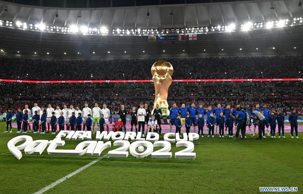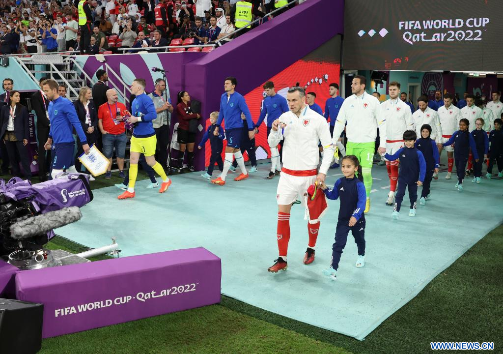 (221129) -- AL RAYYAN, 29 noviembre, 2022 (Xinhua) -- Jugadores de ambos equipos ingresan previo al partido correspondiente al Grupo B entre Gales e Inglaterra en la Copa Mundial de la FIFA 2022, en el Estadio Ahmad Bin Ali, en Al Rayyan, Qatar, el 29 de noviembre de 2022. (Xinhua/Li Ming) (ah) (ce)